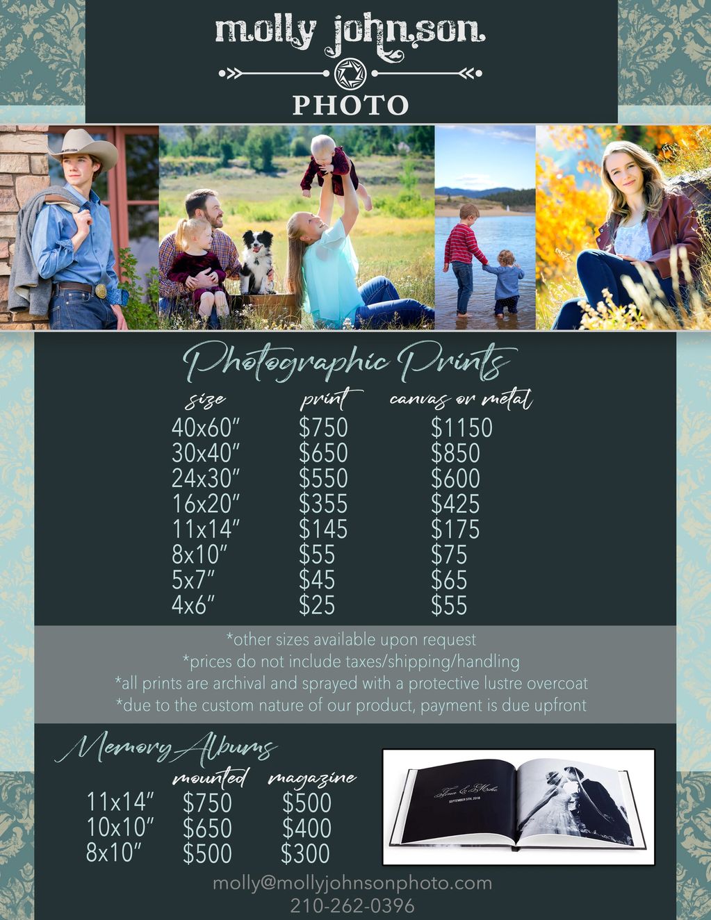 Print prices listed at bottom of this page. Digital gallery for online ordering will be sent within 2-4 weeks of session.